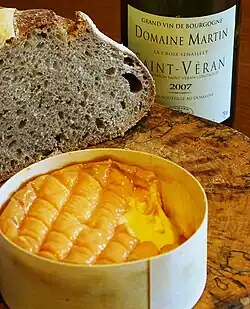 Époisses is a pungent soft-paste cow's-milk cheese. Smear-ripened, "washed rind" (washed in brine and Marc de Bourgogne, the local pomace brandy), it is circular at around either 10 cm (4 in) or 18 cm (7 in) in diameter, with a distinctive soft red-orange color. It is made either from raw or pasteurized milk,[1] and is sold in a circular wooden box. The rind is edible.[2]