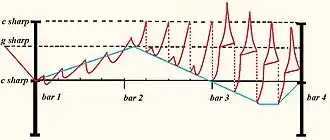 Like all of Chopin's other études, this work is in ABA form though the B section does not represent a contrasting and independent middle section in the manner of a trio.[5] The entire piece is based on the same semiquaver motif, which springs from its opening strong sforzato accent to rapidly increase its volume and compass until ending abruptly on a strong sforzato climax.[6] Musicologist Hugo Leichtentritt (1874–1951) presents a graphic curve which illustrates the aggressive character of the motive expanding from second to eleventh in less than three bars.