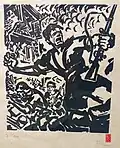 After returning to Belgrade, he created a set of graphics titled Blood-soaked Gold (Krvavo zlato) with the aim of displaying the lives of Yugoslav miners and workers. Although the collection was finished, he was unable to find a printer in Belgrade who would print his work. He printed 10 copies of the collection in his studio in 1936. With the help of architecture student Voja Midić, he reached printer Jovan Luks from Stari Bečej, who agreed to print the collection.[12] In January 1937, the first 250 copies were printed, and soon after, a second edition of 1,000 copies was published, which the writer Jovan Popović wrote the foreword for. The map of graphics depicting the difficult daily life of miners and arduous work, as well as the dissolute life of profiteers, was banned by the Belgrade City Administration in February of 1937.[1][13]