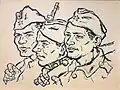 After waiting for two months Kun set off for southern France with smaller group, from where they crossed illegally into Spain. Immediately after his arrival, he underwent military training, during which he was chosen as the commander of Yugoslav volunteers. After completing the training, they were assigned to the International Battalion Đuro Đaković and sent to the front in Albacete. During his stay on the front line, in addition to participating in battle, he made drawings with motifs from the war. Later, at the insistence of Božidar Maslarić and Rodoljub Čolaković, he was transferred to the battalion headquarters. Later, as a cultural worker, he was transferred to the Headquarters of the 129th International Brigade. In Spain, he collaborated with Croatian journalist and writer August Cesarec and made seven drawings to illustrate his manuscript, published in Toronto in 1938 under the title Spanish Encounters (Španjolski susreti), a book of encounters with people and cities. In May 1938, by order of the KPJ, he was transferred from the front in Teruel to Barcelona, where he was informed that he had to return to Paris. In Barcelona, he had a meeting with Kosta Nađ. As he had no documents, he had to cross the border illegally.[15]