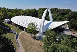 In 1900, on the lands donated by Johannes Quistorp, was developed the Jan Kasprowicz Park (originally known as the Quistorp Park), which, with the area of around 27 ha, became the largest urban park in Szczecin. It was formed to the east of current Słowackiego Street, in the Niemierzyn Valley and around lake Rusałka, and forming part of the Ueckermünde Heath.[13][14] In 1927, to the south, at current Skargi Street, was also developed the Bright Meadows Square (originally known as the Quistorp Meadow).[15] In the 1930s, within the park was opened the Summer Theatre with wooden openair stage. In 1976, in its place was built a new concrete building, becoming one of the largest amphitheatres in Poland. It was renovated in 2022.[16][17]