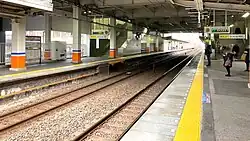 The station has two opposed side platforms with two tracks, with an elevated station building above the tracks and platforms at a right angle.