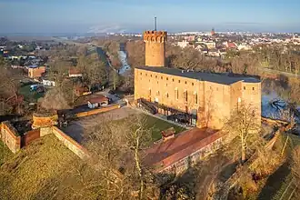 Teutonic Castle in Świecie (Polish: Zamek krzyżacki w Świeciu) is a partial ruin located in Świecie.[1] The partial ruin is kept in full-shape from the bank of the river Vistula and Wda - together with a circular tower topped with merlons. The castle is part of a complex built by the Teutonic Knights in the Gothic architectural style.[2] The castle was built on the site of a Pomeranian dukes' gord - located by the site of the castle. Formerly the castle had four corner towers, one of which survived. The castle is surrounded by a defensive wall and a moat. In 1410 the castle was looted by Polish forces obliterated the castle. The castle was owned by the Kingdom of Poland after the Second Peace of Thorn in 1466. In the sixteenth century, Castellan Konopacki reconstructed the castle into the Renaissance architectural style. The castle was devastated after the Deluge and since then was not rebuilt. The castle was furthermore devastated after Prussian forces used the castle as training grounds. Currently the castle houses a museum, with the tower and castle renovated.[3]