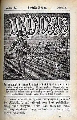 Ūkininkas or Ukinįkas (literally: The Farmer) was a monthly Lithuanian-language newspaper published during the Lithuanian press ban by the editorial staff of Varpas from 1890 to 1905. Ūkininkas was printed in Tilsit (current Sovetsk) and Ragnit (current Neman) in German East Prussia and smuggled into Lithuania by the knygnešiai.