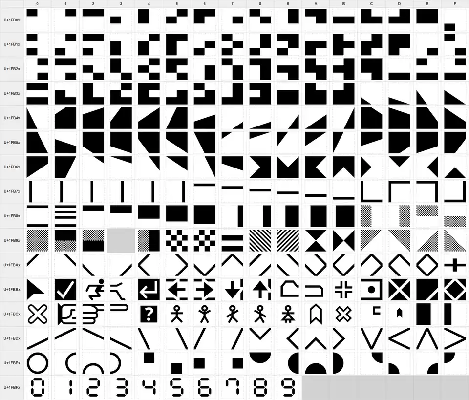 | U+1FB8x | 🮀 | 🮁 | 🮂 | 🮃 | 🮄 | 🮅 | 🮆 | 🮇 | 🮈 | 🮉 | 🮊 | 🮋 | 🮌 | 🮍 | 🮎 | 🮏 |