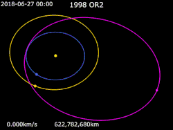 (52768) 1998 OR2 (provisional designation 1998 OR2) is an asteroid on an eccentric orbit, classified as a near-Earth object and potentially hazardous asteroid of the Amor group, with a diameter of 2 kilometers (1.2 mi). It was discovered on 24 July 1998, by astronomers of the Near-Earth Asteroid Tracking (NEAT) program at the Haleakala Observatory, Hawaii. It passed very near to Earth on 29 April 2020 at around 4:15am.[3] It is one of the brightest and therefore largest potentially hazardous asteroids known to exist.[7] With an observation arc of 37.27 years (13612 days),[2] the asteroid has a well-determined orbit, and its trajectory is well known through the year 2197.[2] The asteroid's orbit is only potentially hazardous on a time scale of thousands of years.[8]