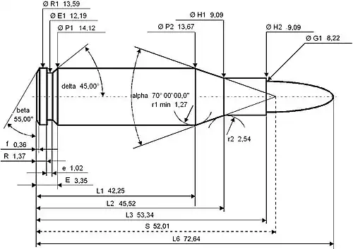 Americans would define the shoulder angle at alpha/2 ≈ 35 degrees. The common rifling twist rate for this cartridge is 254 mm (1 in 10 in), 4 grooves, Ø of the lands = 8.00 mm, Ø grooves = 8.20 mm, land width = 4.47 mm and the primer type is large rifle.[6]