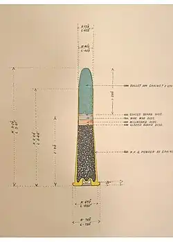 Work on the cartridge did not progress quickly and it took until 1885 for further designs to be produced. The only major change was to change the cartridge from a tapered case to a parallel-sided bottlenecked case in drawing RL 5072, as this was easier to produce, even though it required the rechambering of all the arms using it.[2] A mass-produced trials rifle, the Pattern A, was produced for the bottle-necked cartridge.