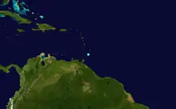 A tropical storm passed through the southern Lesser Antilles on July 10. Overall documentation on the storm was weak, and its track elsewhere is unknown.[3] Owing to the lack of information, climate researcher Michael Chenoweth proposed the removal of this storm from HURDAT in a 2014 reanalysis study.[5]