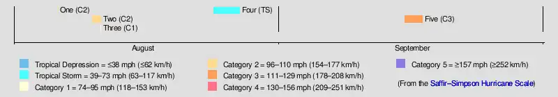 | Five | September 15–17 | Category 3 hurricane | 125 (205) | 945 | Gulf Coast of the United States (Louisiana) | Unknown | 1 | [12] | ||