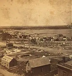 The Great fire of Portland, Maine, sometimes known as the 1866 great fire of Portland, occurred on July 4, 1866—the second Independence Day after the end of the American Civil War. Five years before the Great Chicago Fire, this was the greatest fire yet seen in an American city. It started in a boat house near today's Hobson's Wharf on Commercial Street, likely caused by a firecracker or a cigar ash.[1] The fire spread to a lumber yard and on to a sugar house, then spread across the city, eventually burning out early the next morning on Munjoy Hill in the city's east end.[1][2]