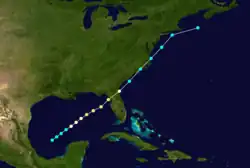 Based on a 1993 reanalysis led by meteorologist C. J. Neumann,[7] the official track begins on September 6 about 110 mi (175 km) north of Turks and Caicos Islands. Trekking west-northwestward, the system passed through the northern Bahamas on September 7. Around 00:00 UTC the next day, the system made landfall near present-day Palm Beach, Florida, with winds of 50 mph (85 km/h). After drifting while just north of Tampa, the cyclone turned northeastward.[5] Despite the system moving over land, it peaked with winds of 60 mph (95 km/h) early on September 9 while passing near Cedar Key,[5] which observed a barometric pressure of 999 mbar (29.5 inHg).[7] The storm reached Maryland before becoming extratropical on September 11. Continuing northeastward, the remnants crossed the Northeastern United States and entered Atlantic Canada before dissipating over southern New Brunswick on the next day.[5] Chenoweth proposed that this storm moved in a zigzag-type path over Florida and Georgia and later may have tracked far enough east to miss Long Island, New York, and instead strike Rhode Island.[4]
