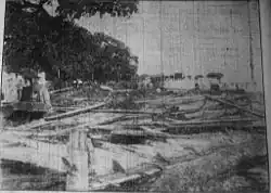 In New Orleans, the storm caused substantial damage, with many homes destroyed and ships wrecked.[17] Communication with the city was completely lost after most of the telegraph wires were downed. Around 3:00 pm on September 21, advisories from the New Orleans Weather Bureau ceased, leading to concerns over the state of the city. Prior to the communication loss, the Weather Bureau reported that waves along the Mississippi River banks were surpassing 3 ft (0.91 m) and water rise in New Orleans itself could reach unprecedented levels. Several lakes overflowed their banks as water from the Mississippi River back-flowed into them, flooding nearby lowlands.[18] The resulting floods, which inundated areas with upwards of 10 ft (3.0 m) of water,[3] were similar in scale to the flooding caused by Hurricane Katrina in 2005, nearly 100 years later. However, due to the lack of residential buildings in the area at the time, the flooding caused far less destruction than that of Katrina.[19] A report falsely claimed that the city's French Quarter was "swept away". A total of 306 coal barges sank off the coast of New Orleans and Lobdell (West Baton Rouge Parish), incurring over $1 million in losses.[17] Nearly every sugar cane plantation between New Orleans and Baton Rouge sustained damage, resulting in at least $1 million in losses.[20]