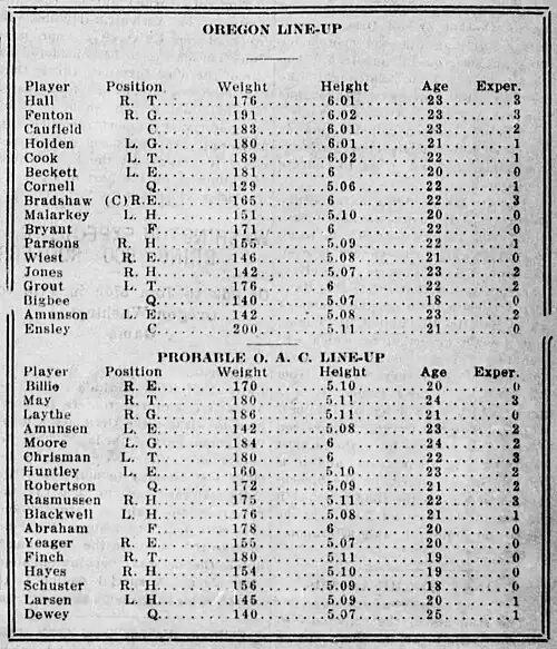 - ^ "O.A.C. wins rough game from Pullman". The Tacoma Daily Ledger. November 16, 1913. Retrieved October 23, 2022 – via Newspapers.com.