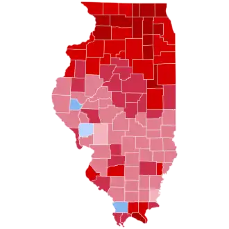 As it turned out, the editorial estimate was shown extremely conservative by the very earliest reports on polling day, which showed Harding winning by three-to-one.[9] Ultimately, Harding did not finish with so large a margin as this, but nonetheless he carried Illinois by 42.30 percentage points. This constitutes the biggest margin by which Illinois has been carried in the state's presidential election history, the best performance by any Republican candidate,[4] and the third-best vote percentage overall behind Andrew Jackson’s two efforts in 1828 and 1832. Harding carried all but three counties, and was the first-ever Republican victor in the following counties: Calhoun, Cass, Clinton, Effingham, Gallatin, Hamilton, Jasper, Jersey, Mason, Pike, Schuyler, Wabash and White.[10]
