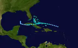 A tropical depression formed about 185 mi (298 km) north-northeast of San Juan, Puerto Rico, early on November 19. Moving west-northwestward, the depression slowly strengthened, becoming a tropical storm on November 20. The following day, it began moving through the Bahamas and peaked with winds of 60 mph (97 km/h),[3] based on observations from the S. S. Mexican.[4] Late on November 21, the storm began moving west-southwestward while centered near Long Island. The cyclone then began steadily weakening. Between 12:00 UTC and 18:00 UTC on November 22, the system made landfall in Cuba near Cayo Romano with winds of 45 mph (72 km/h). Early on November 23, the storm emerged over the Gulf of Batabanó and soon weakened to a tropical depression. The system moved westward, brushing Isla de la Juventud and striking Pinar del Río Province early on November 24. After emerging into the Gulf of Mexico, the storm curved northward and drifted, until dissipating on November 25.[3] This storm was not considered a tropical cyclone until 2009, as part of the Atlantic hurricane reanalysis project, which researches information about past tropical cyclones to reduce inaccuracies and omissions in the best track. The cyclone left no significant impacts in the Bahamas, Cuba, or Florida. A sustained wind speed of 41 mph (66 km/h) was observed at Sand Key Light in Florida.[4]