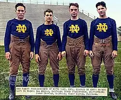 The 1924 Notre Dame Fighting Irish football team was an American football team that represented the University of Notre Dame as an independent during the 1924 college football season. In their seventh season under head coach Knute Rockne, the Fighting Irish compiled a perfect 10–0 record, defeated Stanford in the 1925 Rose Bowl, and outscored opponents by a total of 285 to 54.[1] The team was led by the legendary backfield known as the "Four Horsemen" consisting of quarterback Harry Stuhldreher, halfbacks Don Miller and Jim Crowley, and fullback Elmer Layden.