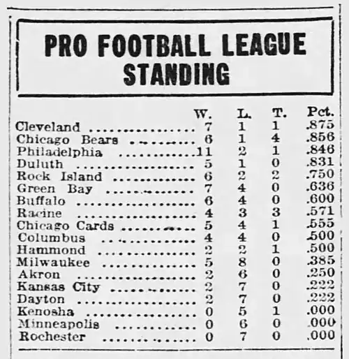 - ^ Art Williams, "Independents Jolt Kenosha All-Stars, 10–6: Forward pass, Field Goal Bring Islanders Holiday Grid Victory," Rock Island Argus, Nov. 28, 1924, p. 29.