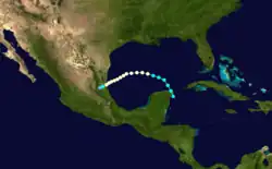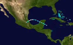 An area of disturbed weather persisted across the northwestern Caribbean Sea in early October. It tracked northwestward over the Yucatán Peninsula, and subsequent to the development of a low-level circulation the system organized into a tropical storm on October 9 while located about 60 mi (95 km) northwest of the capital of Campeche. After moving northward, the storm turned sharply southward, and made landfall in northern Tabasco as a minimal tropical storm on October 10. The system quickly weakened over land, and dissipated over Chiapas on October 11.[9] The system dropped heavy rainfall across southeastern Mexico, though damage, if any, is unknown.[1]