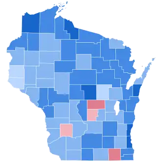 Late in September, polls showed Roosevelt narrowly leading Landon,[14] although a Gallup poll showed him increasing his lead in Wisconsin.[15] Although no later polls were conducted, as it turned out Roosevelt won convincingly and held his two-to-one 1932 margin, carrying all but four counties. Vis-à-vis the 1932 election, Roosevelt gained significantly in the industrial areas of the northwest – in Douglas County he gained 24 percent on his 1932 figures – and in the urban southeast,[16] but lost in the rural areas lying between these two groups. A substantial vote for Lemke from isolationist German Catholics would pave the way for the traditionally Democratic areas in the east to permanently leave the party with the following election, as this group could not accept the urban bias of the New Deal.
