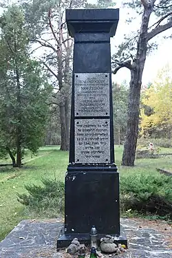 The site of mass executions in the forest in Pietrasze was marked and fenced after the war. The victims are commemorated by a concrete monument in the shape of a black obelisk, standing on a plinth covered with white marble slabs. Two boards were hung on it, with an inscription in Polish and Hebrew:[77]