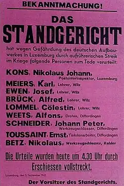 A series of black on red posters were then posted throughout Luxembourg announcing the death of the strikers as a consequence of the strike, bearing the names, occupation, and residency of each victim. Their families, including their children, were subsequently transferred to work camps, many in Silesia, under very harsh conditions.[7]
