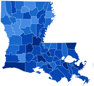 As of 2024, this election marks the last time that a Democratic presidential nominee has carried Bossier Parish.[14] Plaquemines Parish and Lincoln Parish have both voted for a Democratic presidential candidate only once since—for Bill Clinton in 1996—whilst Caddo Parish and Claiborne Parish would not vote Democratic again until Clinton in 1992.[14] It also marked the end of a 64-year Democratic voting streak; four years later, the state would back Dixiecrat candidate Strom Thurmond instead of Democratic nominee Harry S. Truman. As such, this marks the last time that any presidential candidate would carry every parish in the state.