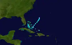 A low-pressure area formed along a dissipating cold front to the north of Puerto Rico. The system moved westward, developing some tropical characteristics by October 13.[5] The next day, the system became a tropical storm over the Straits of Florida.[9] On October 15, it crossed over South Florida near Homestead with winds of 60 mph (95 km/h).[5] While it is unclear whether this cyclone ever became fully tropical, it is entered into HURDAT as a tropical cyclone.[3] The storm intensified further over the Florida peninsula, peaking at 65 mph (105 km/h) early on October 16.[9] After affecting Florida, the storm crossed the western Atlantic and moved across the Outer Banks.[5] The storm became extratropical on October 17, and the next day it was absorbed by another extratropical storm.[19]