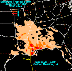 During the second week of June, a tropical wave traversing the Yucatán Peninsula commenced interacting with a trough extending from the Gulf of Mexico to the western Atlantic Ocean, which generated a disturbance over the Bay of Campeche, that spawned a tropical depression on June 12. The newly developed tropical cyclone tracked northward, quickly intensifying into a tropical storm. It attained peak winds of 60 mph (95 km/h) on June 13, although it never developed a well-defined circulation. In addition, it had characteristics of both a tropical and extratropical cyclone, with cooler air aloft. Late on June 13, the storm made landfall near Cocodrie, Louisiana, and its lowest pressure of 1,001 millibars (29.56 inHg) was measured over land, suggesting it did not weaken substantially after landfall.[5][9] After moving inland, it dissipated on June 15 over Arkansas.[9]