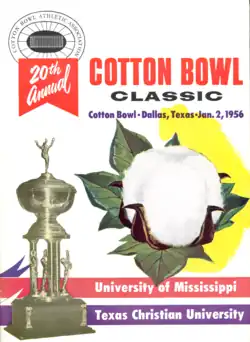The 1956 Cotton Bowl Classic was the twentieth edition of the college football bowl game, played at the Cotton Bowl in Dallas, Texas, on Monday, January 2. Part of the 1955–56 bowl game season, it matched the sixth-ranked TCU Horned Frogs of the Southwest Conference (SWC) and the #10 Ole Miss Rebels of the Southeastern Conference (SEC). Underdog Ole Miss rallied to win by a point, 14–13.[2][3]