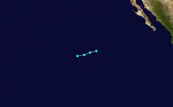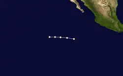 On June 11, a small low pressure system was first identified around 300 mi (480 km) south of the Gulf of Tehuantepec, producing sustained winds which neared 30 mph (50 km/h).[2] By 12:00 UTC the next day, the system intensified into a hurricane with sustained winds of 85 mph (140 km/h),[1] with nearby ship reports indicating that the storm was producing sustained gales. Moving west-northwestward slowly, on June 13, reports from the Portland Star indicated that the hurricane had deepened into a minimum pressure of 29.06 inHg (984 hPa) and was producing gusts exceeding 115 mph (185 km/h).[2] Never intensifying further than 85 mph (140 km/h), the hurricane tracked north-northwestwards prior to making landfall around 150 mi (240 km) east-southeast of Manzanillo, in the state of Guerrero.[1][2] Weakening rapidly, the hurricane was last noted on June 14.[1][2]