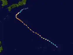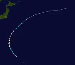 Typhoon Helen, which formed on September 9, rapidly intensified to a 175-mile-per-hour (282 km/h) super typhoon on the 14th. It moved to the northeast, and steadily weakened until hitting southeastern Japan as a 105-mile-per-hour (169 km/h) typhoon on the 17th. It paralleled the Japanese coastline, and after turning northward it became extratropical on the 19th in the Sea of Okhotsk.[5] Helen's effects caused 24 fatalities (with 44 missing) and 108 injuries.[6]