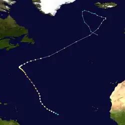 A stationary front across the central Atlantic Ocean led to the development of a low pressure area by November 16, northeast of the Lesser Antilles. A day later, it is estimated that a tropical depression developed, although due to the system's large size, it was possible it was a subtropical cyclone. The depression moved northeastward and slowly intensified, based on observations from nearby ships. On November 19, the depression strengthened into a tropical storm. The storm strengthened to reach peak winds of 60 mph (97 km/h) on November 20. By that time, a cold front was approaching the storm, causing the storm to transition into an extratropical cyclone on November 21; later that day, the front absorbed the former tropical storm.[6]