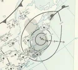 TIROS III imagery indicated a vortex east of the Bahamas between September 9 and September 12.[9] A tropical depression formed at 12:00 UTC on September 12 near Great Harbour Cay in the Bahamas,[3] after TIROS revealed a surface circulation.[9] The depression tracked northward and intensified into a tropical storm while located offshore North Carolina. Around 12:00 UTC September 14, it made landfall in the state near Topsail Beach, North Carolina, with winds of 45 mph (72 km/h). The storm curved accelerated northeastward and intensified despite mostly remaining over land, striking near the southern tip of the Delmarva Peninsula about nine hours later with winds of 50 mph (80 km/h). After re-emerging into the Atlantic late on September 14, the cyclone made landfall near Islip, New York, with peak winds of 65 mph (105 km/h) around 06:00 UTC on September 15, followed by another landfall near Guilford, Connecticut, about an hour later at the same intensity. The cyclone became extratropical over southern Maine around 12:00 UTC and quickly dissipated.[3]