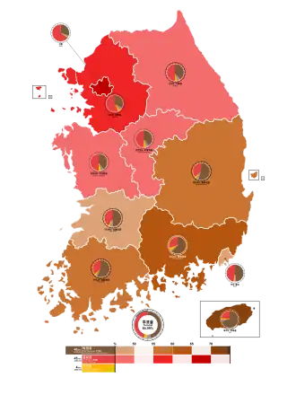 | Jeju | 81,422 | (70.0%) | 26,009 | (22.3%) | 3,859 | (3.3%) | 2,207 | (1.9%) | 3,006 | (2.6%) | 116,503 | ![]() |