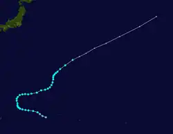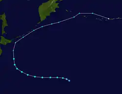 A tropical depression formed in the western Pacific on July 27. Over the next 48 hours, it tracked west-northwestward, intensifying into a tropical storm by July 29. This early phase featured steady organization, with central pressure dropping to 989 hPa by July 30. Georgia reached its peak intensity on August 1–2, with maximum sustained winds of 60 knots (110 km/h) and a central pressure of 982 hPa. The storm then executed a gradual northeastward recurvature east of the Bonin Islands. By August 2, it accelerated toward higher latitudes, maintaining tropical storm strength.
