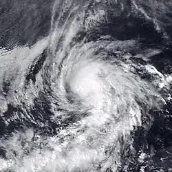 The remnants of the Atlantic's Hurricane Cora crossed into the eastern Pacific in mid-August,[4] becoming the easternmost of successive disturbances across the East Pacific basin.[5] It coalesced into a tropical depression by 18:00 UTC on August 18 and further into Tropical Storm Kristy within six hours.[6] The system acquired an eye on satellite on August 19,[5] and it was upgraded to a hurricane around 18:00 UTC that day. Kristy moved northwest and then west-northwest, further organizing into a Category 2 hurricane with winds of 105 mph (169 km/h) on August 21.[6] Thereafter, the system encountered cooler waters and drier air, which caused it to fall to tropical storm intensity. Environmental conditions improved again by August 25 as Kristy regained hurricane strength, but it soon encountered cooler waters again that prompted a more concrete weakening trend.[5] The cyclone stair-stepped into the Central Pacific prior to dissipating after 00:00 UTC on August 28.[6][7]