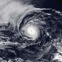 An area of disturbed weather within the ITCZ developed into Tropical Storm Susan around 00:00 UTC on October 18.[7] The storm intensified over subsequent days, becoming a hurricane around 00:00 UTC on October 20 and further developing into a major hurricane by 18:00 UTC the next day. Susan attained Category 4 strength with winds of 130 mph (210 km/h) six hours later,[6] one of the strongest on record in the Central Pacific at that time. Although the powerful hurricane initially tracked northwest toward Hawaii, it sharply veered toward the southwest while succumbing to strong wind shear.[7] Susan weakened rapidly, with winds falling from 115 to 35 mph (185 to 56 km/h) within 24 hours, and dissipated after 00:00 UTC on October 24.[6]
