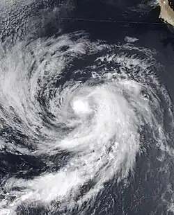 The final storm of the 1978 season began as a disturbance, with origins as an African wave,[4] southeast of Socorro Island on October 18.[5] The system moved northwest, developing into Tropical Storm Sergio at 18:00 UTC that day and reaching peak winds of 40 mph (64 km/h).[6] Sergio maintained this intensity until it began to curve northward into cooler waters,[5] which caused the system to transition into an extratropical cyclone by 00:00 UTC on October 21 and dissipate to the northwest of Baja California Sur after twelve hours.[5][6]