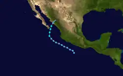 Tropical Storm Paul, the second system alongside Hurricane John without any genesis ties to the Atlantic,[4] was first identified north of Hurricane Olivia on September 22.[5] The system developed into a tropical depression by 00:00 UTC on September 23 but failed to intensify for several days thereafter. Finally, by 12:00 UTC on September 25, the system organized into Tropical Storm Paul.[6] It attained peak winds of 45 mph (72 km/h) six hours later as it curved toward the northeast, narrowly missing Baja California Sur.[5] Paul began to weaken as it approached the Mexico coastline, which it struck as a tropical depression around 12:00 UTC on September 26.[5] Six hours later, the depression transitioned into an extratropical cyclone,[6] which only persisted for an additional six hours before dissipating over northern Mexico.[5]