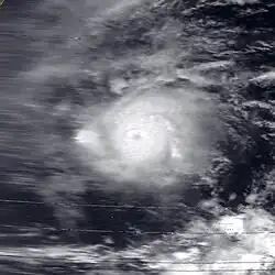 An area of disturbed weather spawned by a tropical wave developed southeast of Acapulco on July 11 and rapidly grew in size.[5] It developed into a tropical depression around 00:00 UTC on July 13 and further into Tropical Storm Gilma six hours later while curving from west-southwest to west-northwest.[5][6] Further organization brought Gilma to hurricane strength around 18:00 UTC on July 15 and major hurricane intensity by 06:00 UTC the next day.[6] By this point, satellite imagery revealed a system with a cloud shield about 920 mi (1,480 km) in diameter and an eye about 15 mi (25 km) wide. Immediately after peak, the effects of cold waters and dry air began to affect Gilma, and the storm weakened rapidly.[5] It degenerated to a disturbance after 00:00 UTC on July 20 while located well west of Baja California.[6] Its well-defined circulation tracked north of Hawaii before dissipating on July 27.[7]