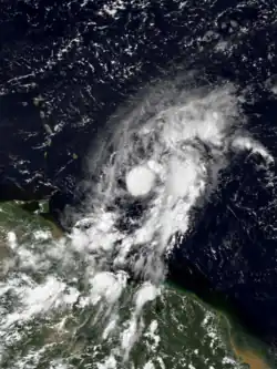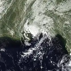 The origins of Tropical Storm Edouard are unclear, but an area of persistent organized storms formed in the Bay of Campeche, which strengthened into a tropical storm on September 14. Edouard rapidly intensified, with wind speeds reaching 65 miles per hour (105 km/h) in 18 hours as a faint eye feature became visible. Following its strengthening, Edouard dissipated even more quickly, degenerating into an area of thunderstorms the next day.[36] The remnants of Edouard moved over land near the port of Veracruz.[37]