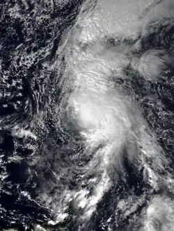 On September 14, a well-defined tropical wave exited the coast of Africa. The next day, it had rapidly organized into a tropical depression. On the afternoon of September 16 the depression attained tropical storm strength, and it was given the name Fran. It turned to the northwest, and passed very near the Cape Verde.[38] 31 people were killed in the country.[39] Fran continued between the northwest and west-northwest on September 17–18 as it continued to organize. During this period satellite imagery indicated that Fran peaked with winds of 65 mph (105 km/h) and a minimum surface pressure of 994 mbar (29.35 inHg). As Fran passed the Cape Verde islands weather stations reported 35 miles per hour (55 km/h) winds, which is tropical depression force. During the period of September 19–20 Fran turned towards westward and began to encounter strong upper-level wind shear, which caused Fran to dissipate on September 20.[38]