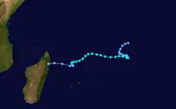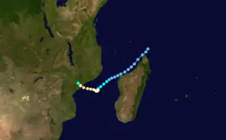 On January 22, a tropical disturbance formed to the southeast of Diego Garcia.[13] It moved generally to the west-southwest, intensifying into a tropical storm on January 23. That day, the Mauritius Meteorological Services named the storm Doaza,[14] and the JTWC classified it as Tropical Cyclone 09S.[2] On January 25, Doaza passed north of Tromelin Island,[14] and around that time it attained an initial peak of 80 km/h (50 mph).[13] Later that day, the storm struck eastern Madagascar near Île Sainte-Marie, and it quickly weakened over land,[14] so much so that the JTWC discontinued advisories.[2] However, Doaza emerged into the Mozambique Channel on January 26 near Mahajanga and soon after reorganized while curving to the south.[14] The JTWC again issued advisories on January 28,[2] around which time Doaza passed just southeast of Juan de Nova Island. On the next day, the storm attained tropical cyclone status, reaching winds of 135 km/h (84 mph) just west of Europa Island. On January 30, the JTWC estimated peak 1 minute winds of 215 km/h (134 mph), by which time the storm was moving due southward.[13] Doaza turned to the southeast and quickly weakened, dissipating within the westerlies on February 1.[14]