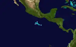 A tropical depression formed 310 mi (500 km) south of Mexico on July 5 and immediately strengthened into a tropical storm the next day. Calvin headed generally east. On July 8, as a strong tropical storm. It then gradually weakened, falling to a depression on July 9 and dissipated the next day while located 440 mi (710 km) southwest of Cabo San Lucas.[3]