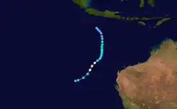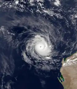 On 5 November, the JTWC started to monitor a tropical disturbance, that was located about 840 km (520 mi) to the southeast of Jakarta, Indonesia.[2] Over the next 24 hours the disturbance remained near stationary before moving slowly towards the north-west over the next few days. The JTWC then initiated advisories on Tropical Cyclone 02S during 8 November, with 1-minute sustained windspeeds equivalent to a tropical storm on the SSHS. During that day while 02S continued to move towards the west, 02S intensified quickly to obtain 1-minute sustained windspeeds of 100 km/h (60 mph). The system continued to move westwards without intensifying any further until it moved into the South-West Indian Ocean during 11 November where it was named Barisaona, by the Mauritius Meteorological service. According to the Reunion Meteorological Service, Barisaona ultimately peaked on 16 November with 10-minute sustained windspeeds of 140 km/h (85 mph), while the JTWC estimated that the cyclone peaked on 17 November with 1-minute windspeeds of 185 km/h (115 mph). The cyclone then dissipated around 23 November.