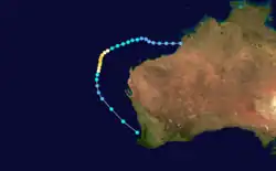 Forming out of a tropical low on 17 April, Orson gradually intensified as it tracked towards the west. After attaining Category 5 intensity on 20 April, the storm began to track southward and accelerated. The following day, the cyclone reached its peak intensity with winds of 250 km/h (155 mph) and a barometric pressure of 904 hPa (mbar).[19] Orson maintained this intensity for nearly two days before making landfall near Dampier. The cyclone rapidly weakened after landfall as it accelerated to the southeast. After moving into the Great Australian Bight on 24 April, the storm dissipated.[20]