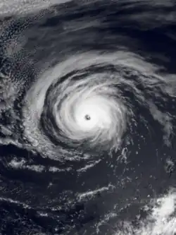 However, a well-defined eye reappeared on satellite imagery in the system and Kevin re-intensified to a low-end Category 3 hurricane with maximum winds of 115 mph (185 km/h) and a minimum pressure of 960 mbar (28 inHg) on October 7. But this was short-lived and on October 8 the hurricane began to weaken again and on October 9 it had entered into the Central Pacific basin as a waning Category 1 hurricane.[37] After this crossing, it was subsequently downgraded to storm strength the same day and on October 11, to a depression. It dissipated as a tropical cyclone that same day. The remnant circulation did persist a while longer as it slowly drifted north to finally lose its identity late on October 14.[19] Despite its long life, Hurricane Kevin caused no damage or casualties.[37] Because Kevin passed north of Hawaii, its only effect on land was increased trade winds.[19]