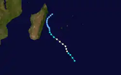 The ITCZ spawned an area of convection on January 11 near the Chagos Archipelago. A circulation developed within the system on January 13 about 400 km (250 mi) southwest of Diego Garcia, and at that time it became a tropical disturbance. A large ridge to the south steered the system generally to the southwest. The disturbance intensified into a depression on January 14,[4] the same date that the JTWC initiated advisories on Tropical Cyclone 10S,[6] and following an increase in convection, the depression intensified into Moderate Tropical Storm Colina on January 15. Turning more to the south-southwest, Colina strengthened further into a tropical cyclone on January 18, developing a 30 km (19 mi) eye.[4] On the next day, the cyclone attained peak 10-minute winds of 135 km/h (85 mph), according to MFR, while the JTWC estimated peak 1-minute winds of 175 km/h (110 mph).[10] That day, the eye crossed over the western portion of Réunion at around 14:30 UTC, exiting 45 minutes later. Subsequently, Colina accelerated to the southeast over cooler waters, weakening in the process. On January 20, the cyclone weakened to tropical storm status, and the next day Colina became extratropical, dissipating two days later.[4]