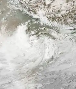 Described by the JTWC as having "one of the most unusual tracks in North Indian Ocean cyclone history",[3] the storm originated as an area of convection that formed on October 14 in the southern Bay of Bengal. Moving westward, it struck near Chennai on October 17 as a well-defined low-pressure area. It crossed southern India and emerged into the Arabian Sea on October 20. The system developed into a depression on October 22 and quickly intensified while moving northward. By October 24, the cyclone approached hurricane intensity as it developed an eye. The IMD estimated peak 3-minute winds of 110 km/h (70 mph), and the JTWC estimated peak 1-minute winds of 120 km/h (75 mph). On October 25, the storm abruptly stalled and weakened offshore Gujarat and progressed southwestward as a minimal storm. It was no longer classifiable as a tropical cyclone by October 28, although its remnants persisted until November 2 when they dissipated east of Somalia.[1][3]